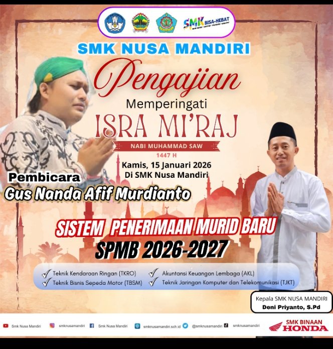Sementara itu, dikatakan langsung oleh Kepala Sekolah SMK Nusa Mandiri, Deni Priyanto S.Pd, Pengajian Akbar kali ini selain memperkuat landasan Agama juga jadi sarana dan prasarana menyambut Tahun Ajaran Baru yakni momentum Penerimaan Siswa Baru Tahun ajaran 2026-2027.